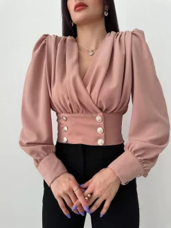 2023 Custom Women Long Lantern Sleeve Button Shirt Elegant Chic Tunic Tops Elegant Ladies Unique Slim Waist Tops Blouse